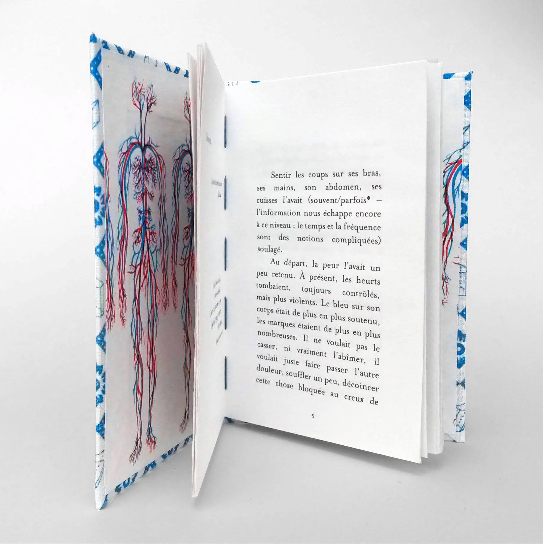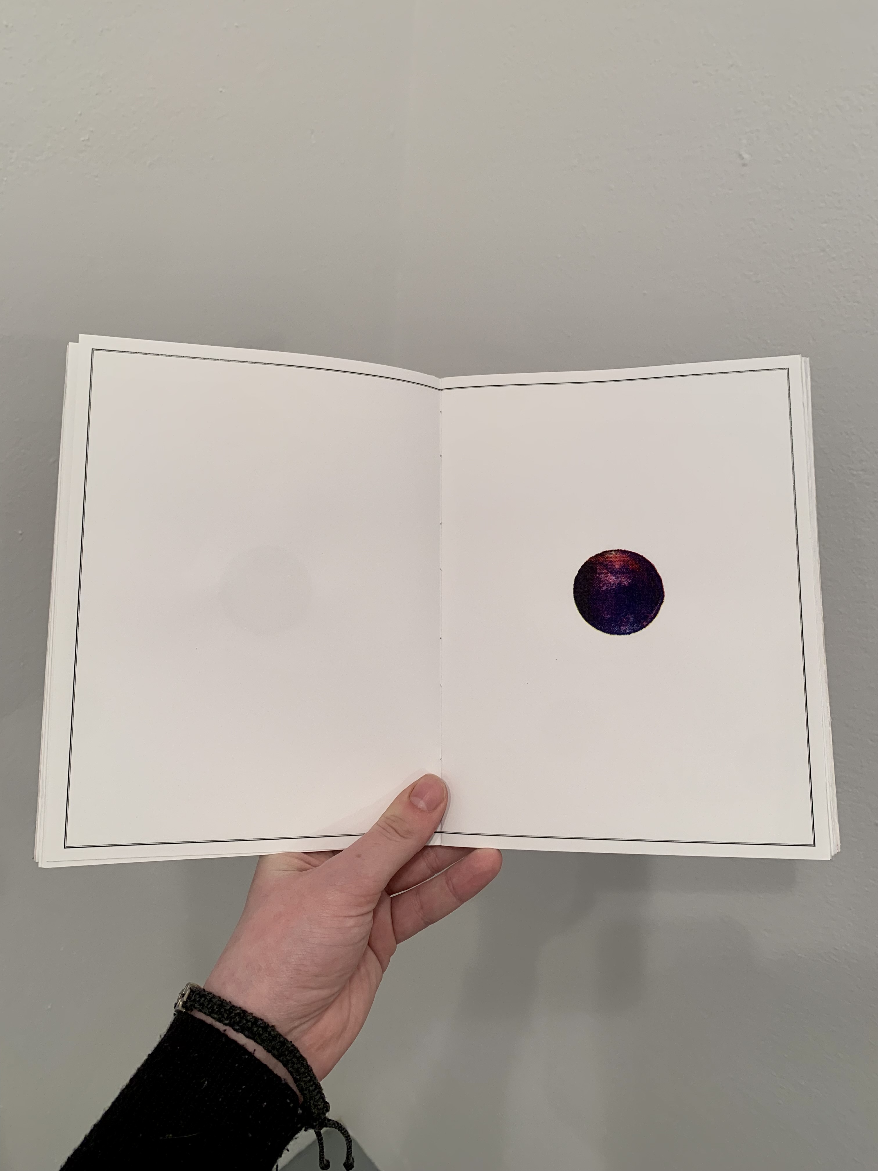 L’observation/l’étape de départ, était présentée sous la forme d’un livre unique réalisé en aquarelle ayant l’apparence, les codes d'un atlas. Ce format de poche d’une collection « bleue » (re)présentait l'évolution chromatique d'un hématome, jour par jour.