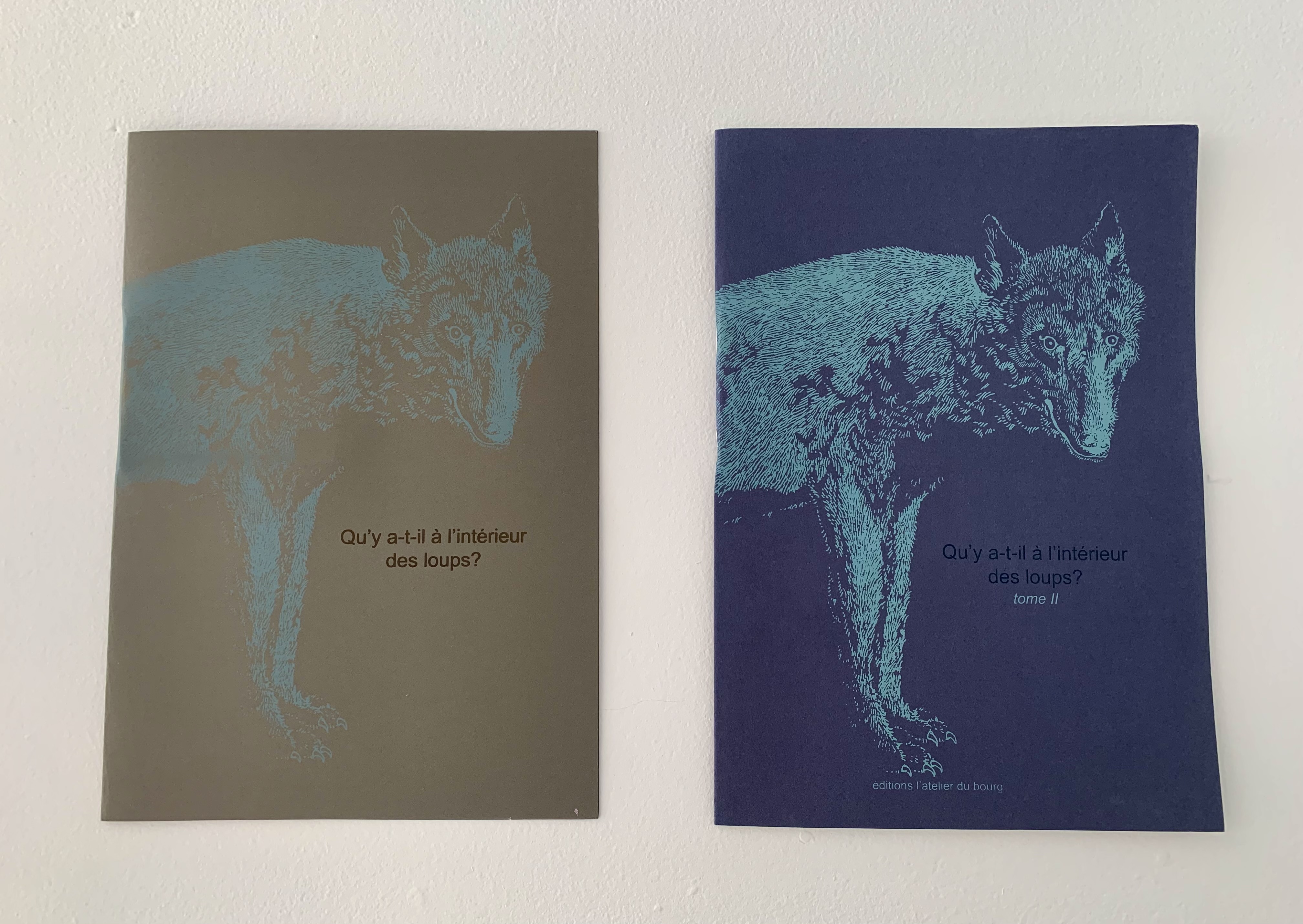 Ouvrages "pour enfants" autour de ce que l'on peut trouver à l'intérieur d'un loup, de ce qu’il peut avaler, que ce soit en réalité, dans les contes… Interrogation à cheval entre mythe/conte, imaginaire et réalité (norme de la nature mais aussi déviance écologique) "Qu'y a t-il a l'intérieur des loups • tome 02" (couverture bleue/ tiré à 10 exemplaires) est un exemplaire à compléter – certaines pages contiennent déjà des éléments et d'autres non et sont donc à investir par le lecteur.