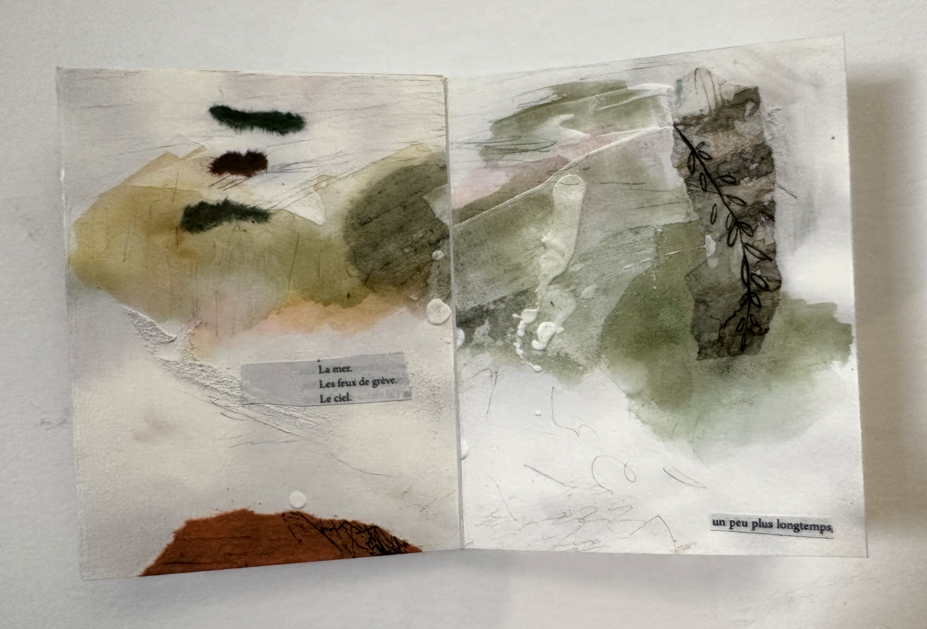 Reliure cousue. Reproduction de photogravure, collagraphie, dessin, collage, couture.