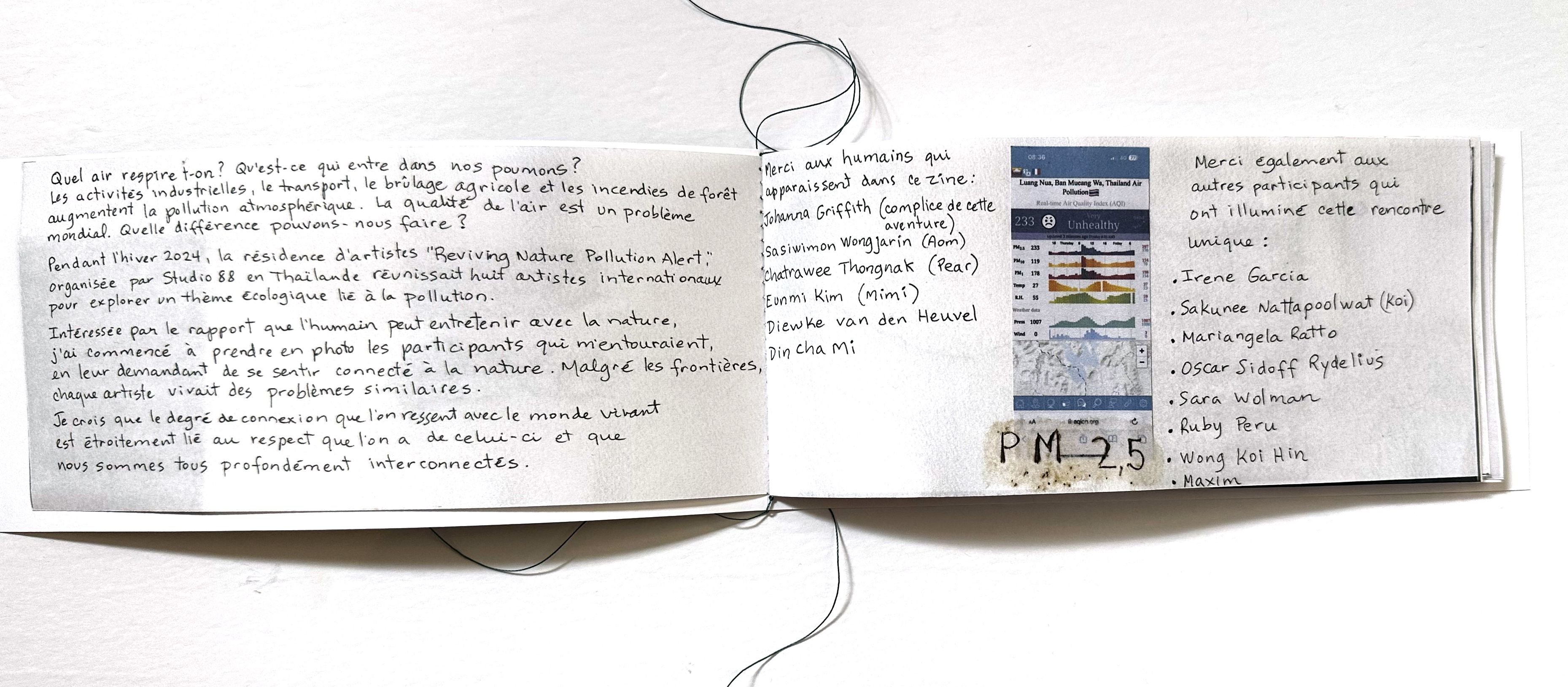 « Le zine "Vouloir raviver la nature" fait suite à une résidence d'artistes que j'ai réalisé au Studio 88 en Thaïlande sur le thème de la pollution de l'air. C'est une réflexion sur l'air qu'on respire et sur le rapport que l'humain entretient avec la nature. »